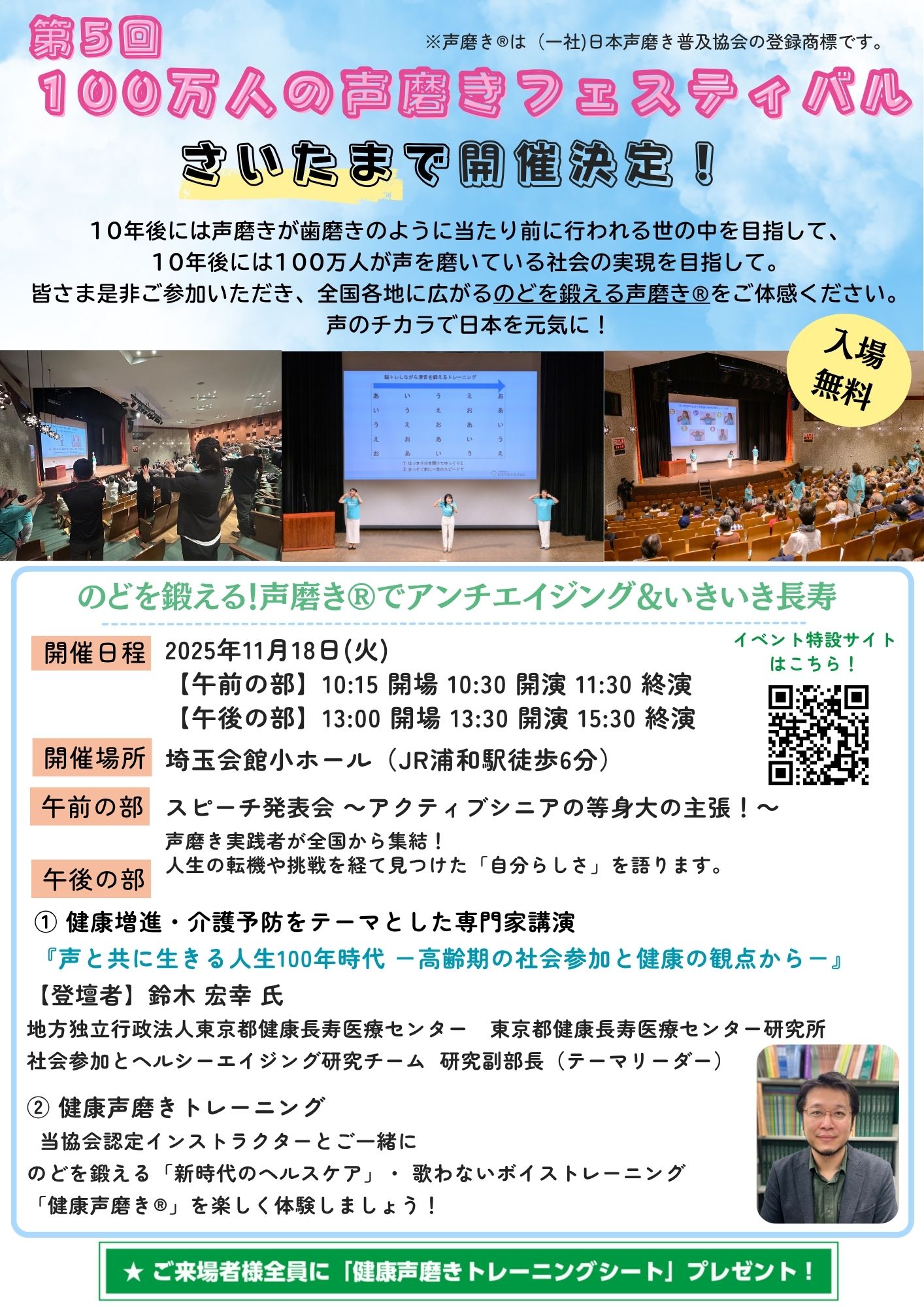 皆さま是非ご参加いただき、全国各地に広がる「のどを鍛える健康声磨き®」をご体感ください。