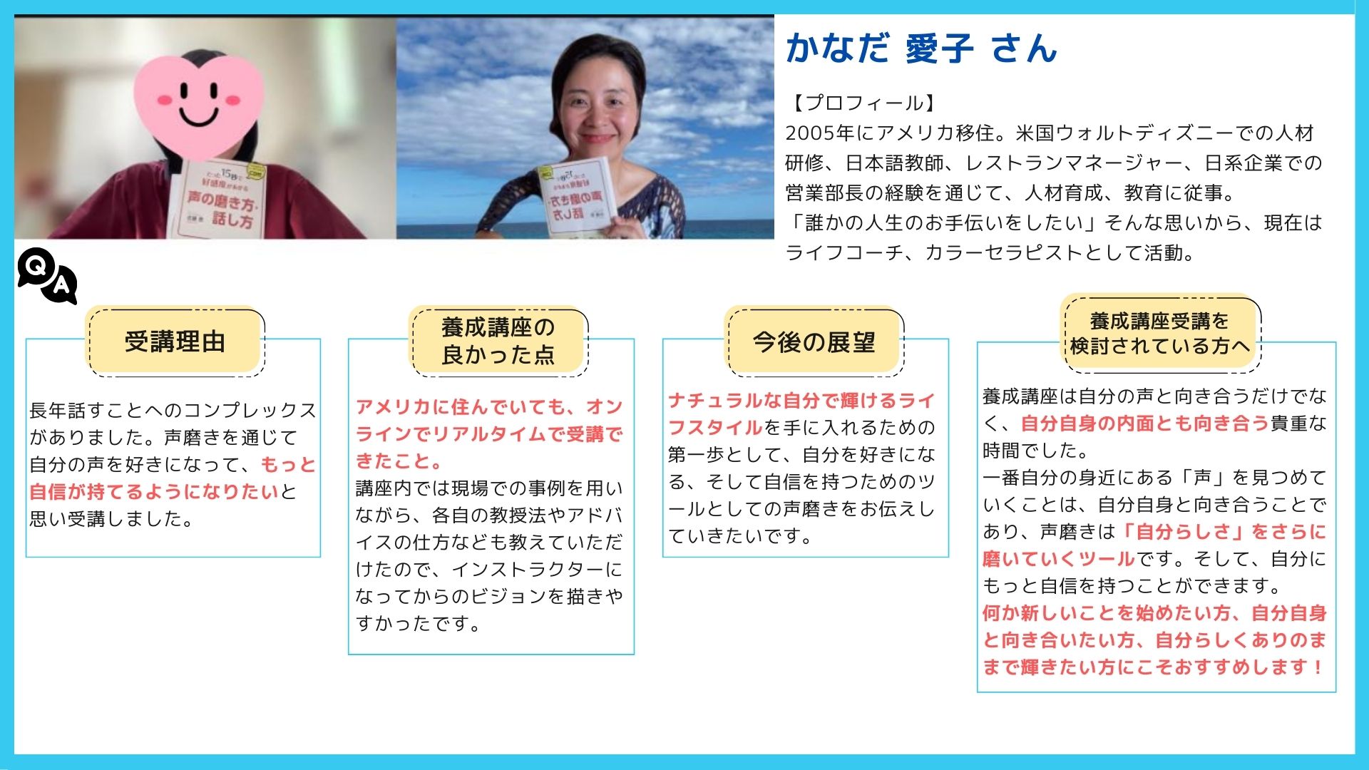 様々な角度からアプローチし『確固たる切り札声』を作っていく、という目標までのプロセスがしっかりと構築されているので、とてもわかりやすく、パズルを完成させていく様なワクワクした気持ちで取り組む事ができます。養成講座ではまずは声磨きトレーニングを学び、自分もその効果を実感した上で、インストラクターとしてのノウハウを学び、認定試験後は実際に活動していく為のバックアップも受けることができます。自分自身の成長を感じながら、着実にステップアップしていくことができる、というのがこの講座の最大の魅力だと思います。(40代 女性)