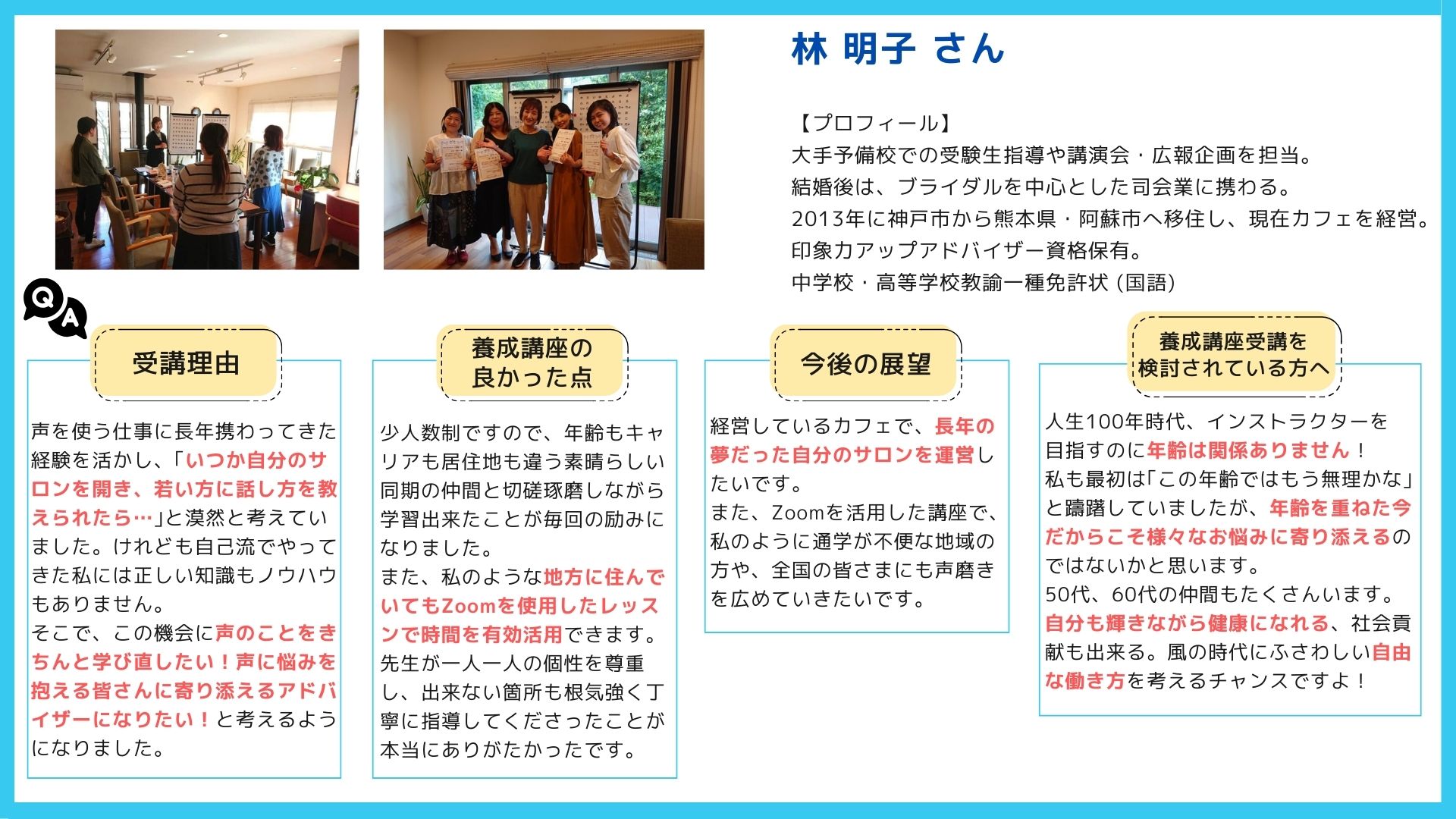 長い間声楽での発声が身に付いており、話すときの発声は違うことなど自分の声の癖に気づかせていただき、とても感謝しております。インストラクター合格が目的ではなく、その後のサポートもしっかりして頂けるのも魅力的です。(60代 女性)