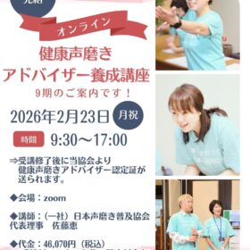【1日完結!健康声磨きアドバイザー養成講座 9期受講生募集のお知らせ】 本日は声を通じて健康づくりと介護予防に役立つ 「健康声磨きアドバイザー養成講座…
