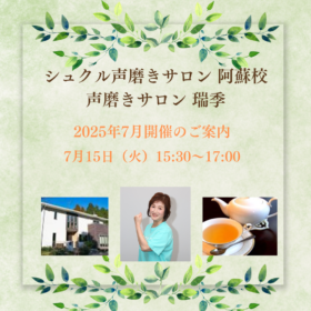 【シュクル声磨きサロン阿蘇校「声磨きサロン瑞季」2025年7月開催日程のご案内】 声磨きインストラクターの林明子先生による、 シュクル声磨きサロン阿蘇…