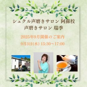 【シュクル声磨きサロン阿蘇校「声磨きサロン瑞季」2025年9月開催日程のご案内】 声磨きインストラクターの林明子先生による、 シュクル声磨きサロン阿蘇…