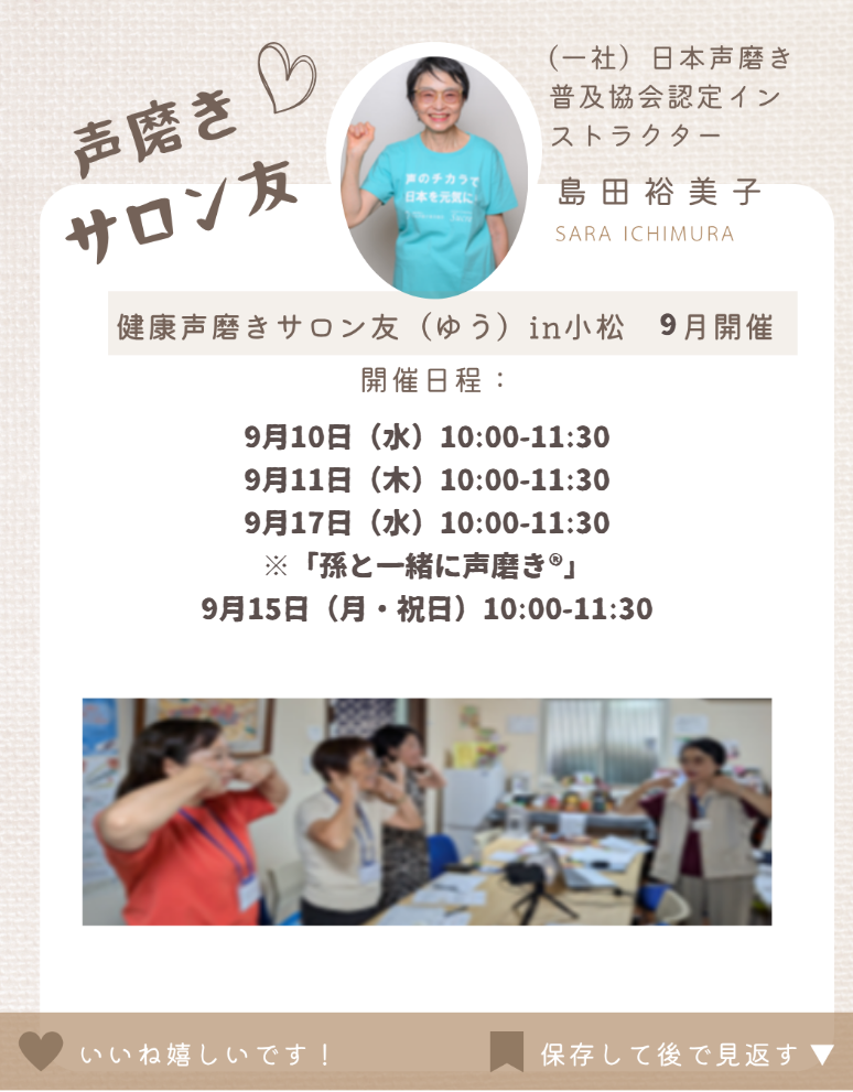 【~あなたの新しい健康法 声磨き®~ 健康声磨きサロン友(ゆう)in小松 9月のご案内】