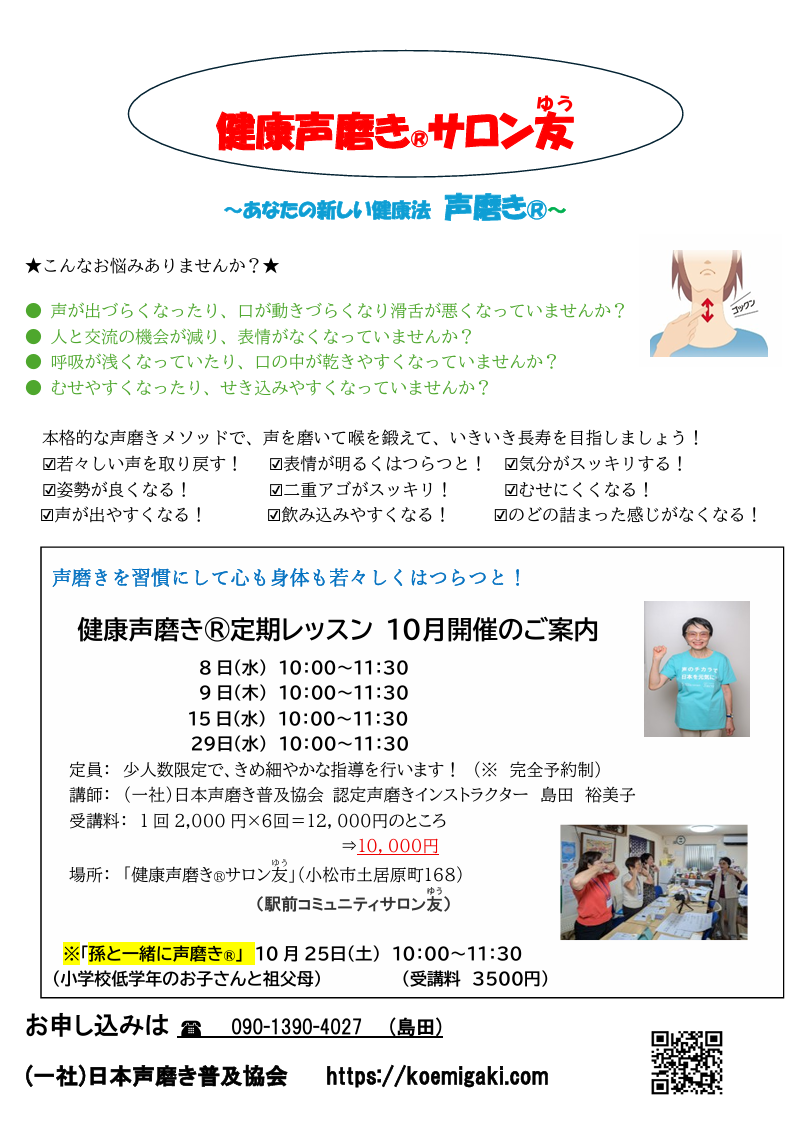 【健康声磨きサロン友(ゆう)in小松 10月開催のお知らせ】